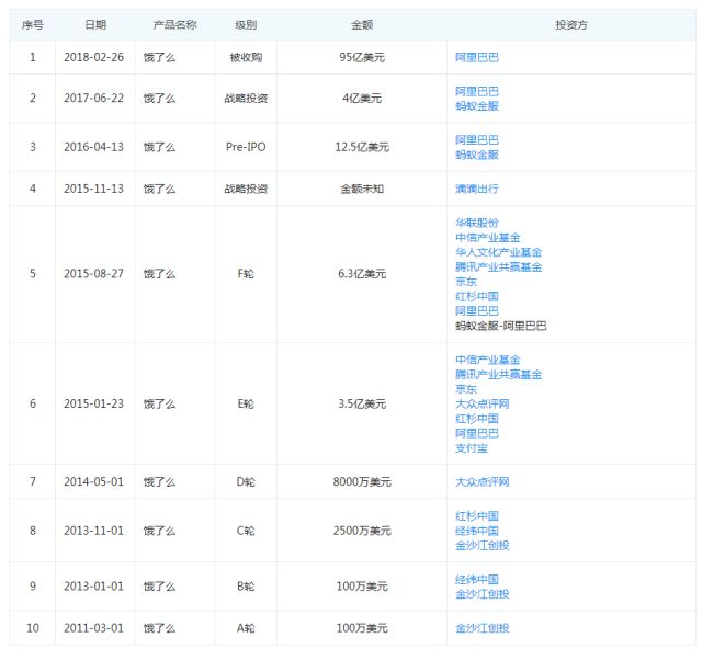 2016年4月,阿里巴巴和螞蟻金服分別對餓了麼投資9億和3.5億美元。阿里消息稱,「餓了麼」該輪(Pre-IPO輪)融資完成後,阿里+螞蟻成「餓了麼」最大股東,持股佔比27.99%。